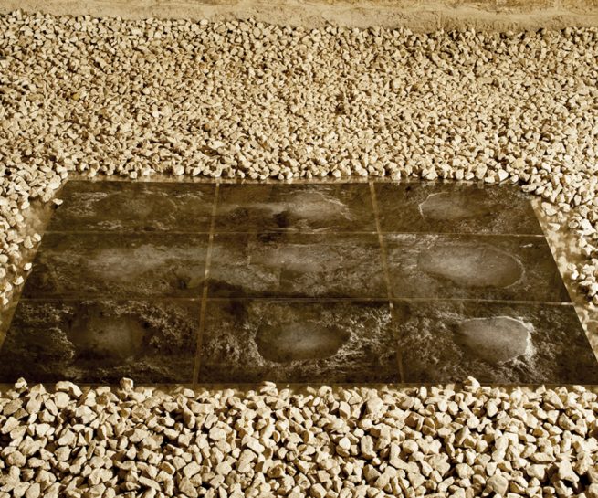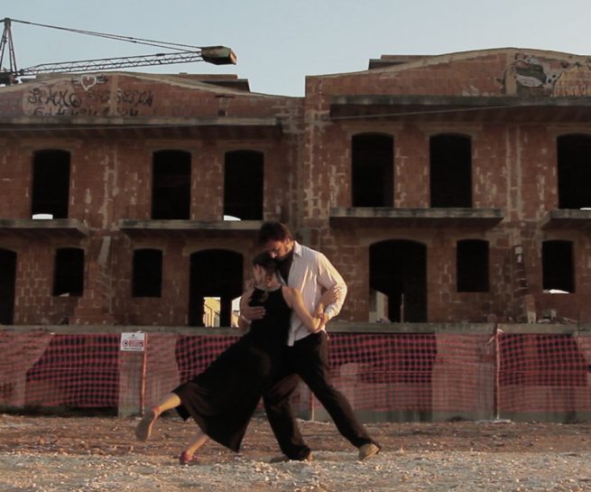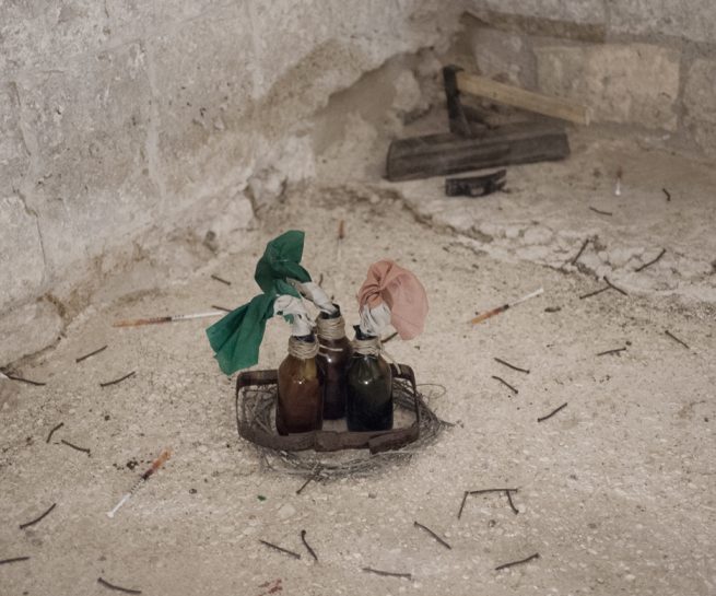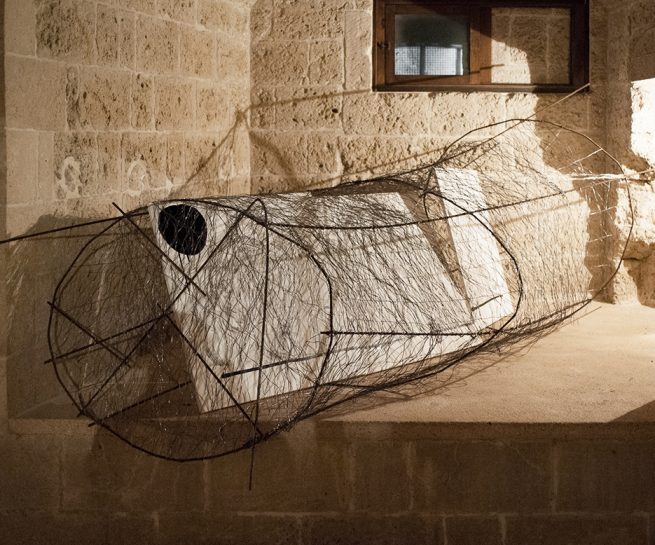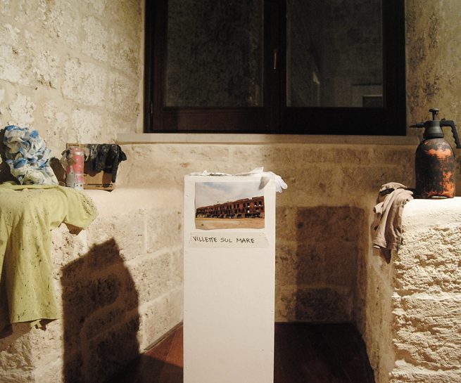 Interventi come quello di Rada Koželj ci conducono nell’intimità dell’individuo e ci invitano a riflettere sulla concezione della coppia come equilibrio tra due entità, creando un ambiente sacro personale, una grotta privata dove le ossessioni e l’immaginario dell’artista stessa assumono fisicità. Questo equilibrio proprio della coppia, intesa come nucleo familiare, è invece lo spunto scelto da Giovanni Cristino, Alisia Cruciani, Giuseppe Pascucci e Maria Susca per intraprendere una riflessione sul caso delle edilizie bloccate che sono rimaste abbandonate nel comune di Mola di Bari. Attraverso un’istallazione che coniuga insieme una ricerca documentale, un progetto scultoreo e un intervento performativo, il fine è quello di avviare un percorso che riflette sulla precarietà, sullo stato di abbandono e sull’inaccessibilità dello spazio divenuto rudere.