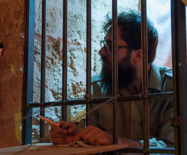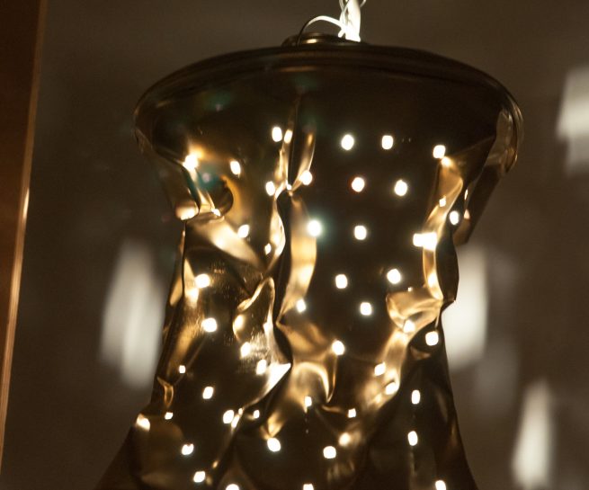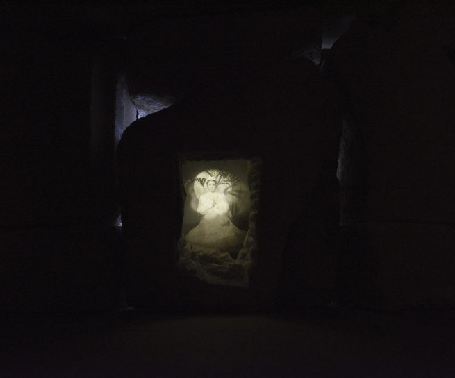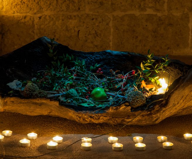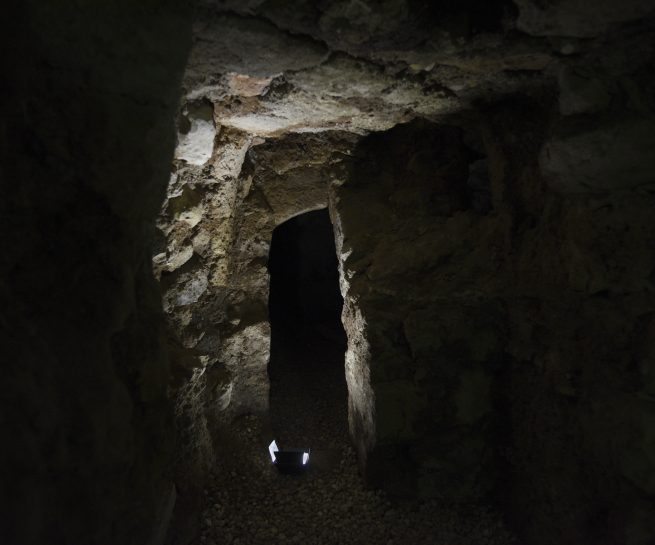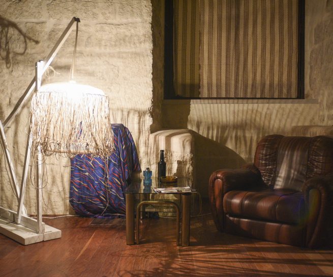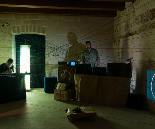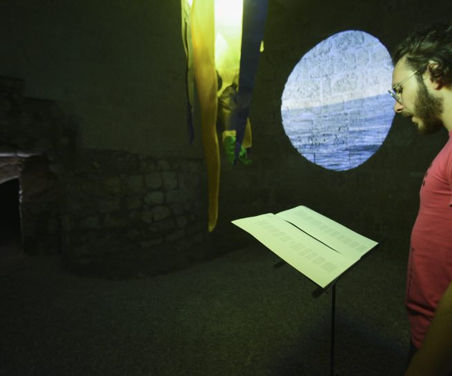 Un’esperienza multisensoriale più intima è offerta dalla stanza disegnata da Giuseppe Pascucci, dove solo uno spettatore potrà entrare, diventando così unico fruitore e testimone dell’opera che rimarrà ignota al resto dei visitatori e sarà distrutta dopo essere stata attivata per la prima ed unica volta. La stessa aura di mistero e curiosità sfiora l’intervento di Ivo Pisanti, che crea un ambiente sperimentale mediante la distorsione sonora di radio in disuso, e i sotteranei del castello, dove i suoni affascinanti, prodotti dalla vibrazione delle corde di una chitarra mosse dal vento nella costa molese e registrati da Tiziano Rossano Mainieri, fungono da cornice per altri due interventi dove lo spettatore viene catturato dalla visione dell’orizzonte in un invito alla contemplazione e alla riflessione. Da un lato, Alisia Cruciani presenta la linea di congiunzione tra mare e cielo come paesaggio immutabile nel tempo ma ancora attraente, sia per la sua bellezza che per l’impossibilità di raggiungerla. Così, attraverso la proiezione dei suoi scatti su una vecchia fotografia, gioca con la metamorfosi cromatica quotidiana dell’orizzonte marino molese; dall’altro lato, Antonio Bolognino cerca l’interazione col pubblico presente, attivando uno spazio avvolgente e riservato di conversazione, dove riflettere e condividere pensieri.