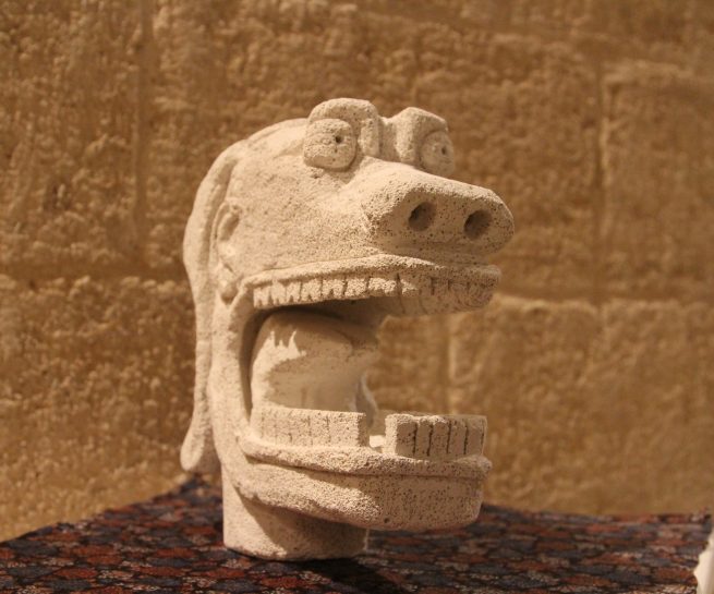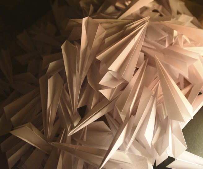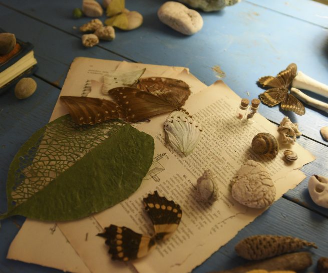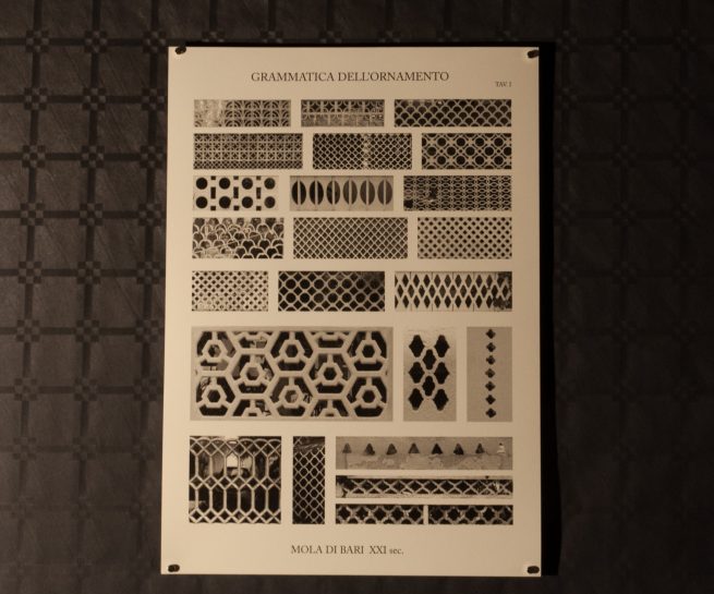 Nel cortile e nelle stanze adiacenti, le narrazioni scorrono tra un passato immaginato e un futuro incerto, portandoci in altre non realtà, svelando nuovi mondi attraverso l’invenzione di contesti storico-scientifici. Seguendo questo filo conduttore, troviamo, nelle sculture create da Giovanni Cristino con materiali edili di scarto, le vestigia di una cultura ancestrale immaginata da Giuseppe Pansini. Riflettendo sulla traccia che l’uomo lascia in maniera indelebile sulla natura e sulla possibilità evolutiva di una flora dell’avvenire, Giovanni Cristino e Andrea Morsolin creano, con scarti di sigarette, delle piante artificiali che fioriscono in un ecosistema ostile ma non necessariamente senza un valore estetico. Seguendo questa metodologia scientifica, Antonio Pipolo e Camila Restrepo ricreano uno studiolo dove il visitante potrà osservare una catalogazione enciclopedica di ibridi creati con i resti di creature e piante che hanno abitato il territorio molese. Nell’opera di Bianca Maria Fasiolo, la cura dell’archivio e l’estetica della catalogazione, si rivelano come scoperta e rivalutazione di piccoli dettagli ornamentali nelle costruzioni popolari dell’architettura molese. Il repertorio da lei creato si presenta sotto forma di atlante tipologico, traendo diretta ispiranzione da un manuale di arte decorativa del XIX sec. Gli scatti fotografici si accostano l’uno all’altro per analogia, concentrando l’attenzione sui piccoli difetti di fabbrica, i materiali umili e la scelta di specifici pattern impiegati per risolvere esigenze funzionali.