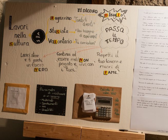 Andrea Morsolin, riprende invece l’aspetto mistico nella sua ode alla macchia mediterranea, area in continua mutevolezza, traccia di boschi di lecci dove il cambiamento dell’ecosistema, la presenza di disturbi naturalie l’aggressività dell’uomo provocano il deterioramento e la possibile scomparsa di un tipo di flora resistente e appena percepita nel paesaggio molese. Nella sua installazione, Rada Koželj ricrea un ambiente liturgico e impenetrabile attraverso la costruzione di una torre in rovina dove nasconde un piccolo altare dedicato a una bambina immortalata nella sua prima comunione. Così, mettendo in gioco il passato, la tradizione ed il misticismo, ricrea uno scenario leggendario dove costringe lo spettatore ad abbassarsi per adottare il punto di vista della bambina e immedesimarsi in lei. Per ultimo, il lavoro di Ana Area Martínez s’interroga sul valore dato dalla società alle produzioni culturali, facendo un esercizio critico dove si sottolineano le frizioni quotidiane e si riflette sulla precarietà inerente al settore culturale, attraverso l’esposizione di una ricerca documentale ricca di dati e testimonianze dirette, raccolte durante i giorni in residenza.