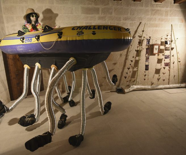 L’elemento ironico in queste finzioni viene usato da Giovanni Cristino, che dispone su di un tavolo un’ipotetico aperitivo immangiabile e da Vito Battista nella sua riflessione sulla figura del turista, abitante di una realtà altra, la vacanza, dove l’uomo riesce a essere spensierato e lontano dalla routine che lo incasella. Allo stesso tempo, grazie al canotto gonfiabile, la spensieratezza diventa libertà piena nel mare. Libertà che nell’installazione al castello si conquista anche in terra, grazie allo sviluppo di una serie di zampe bizzarre, dalle influenze estetiche provenienti dall’animazione del primo novecento, permettendo al turista di vivere nella spensieratezza (per sempre).
