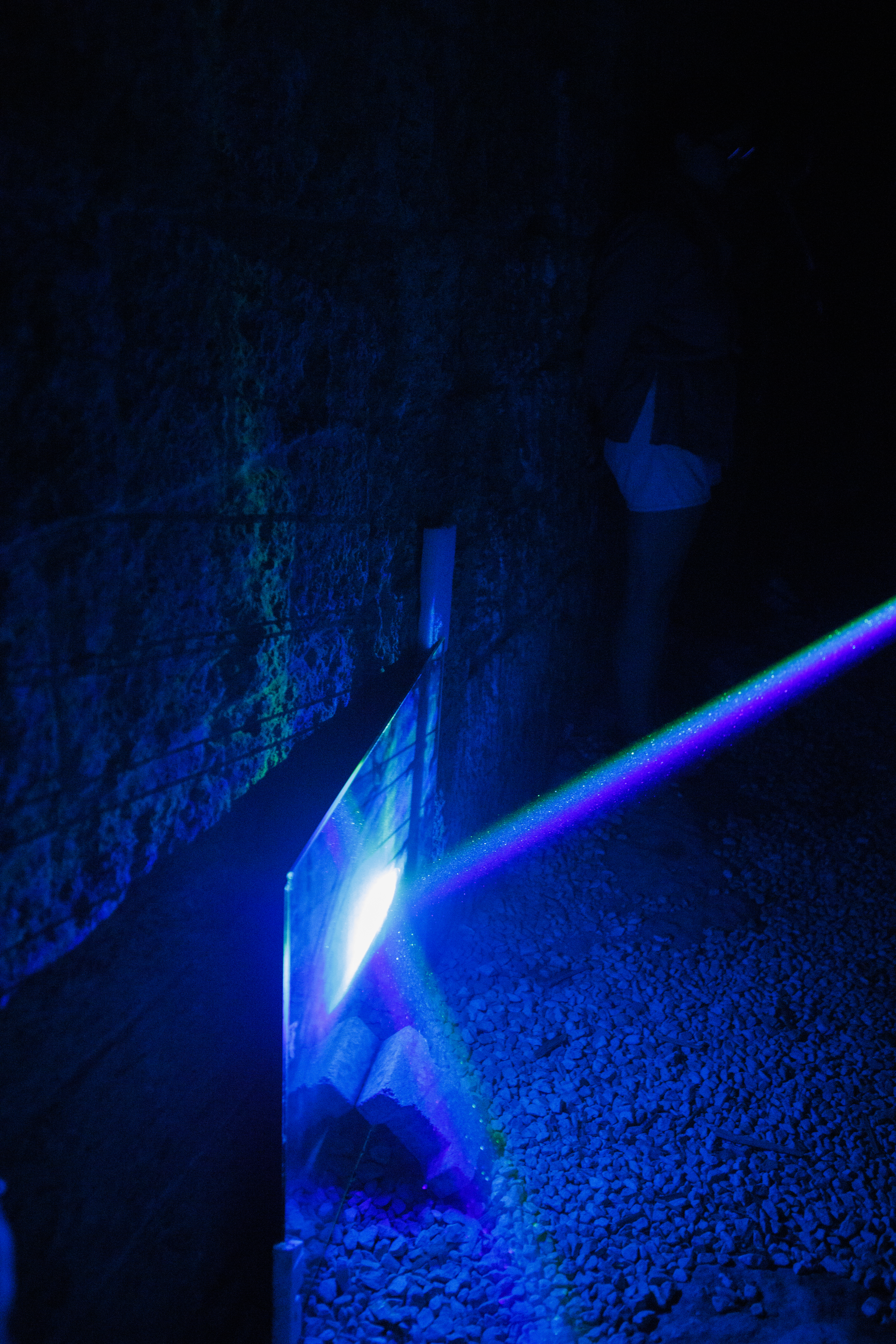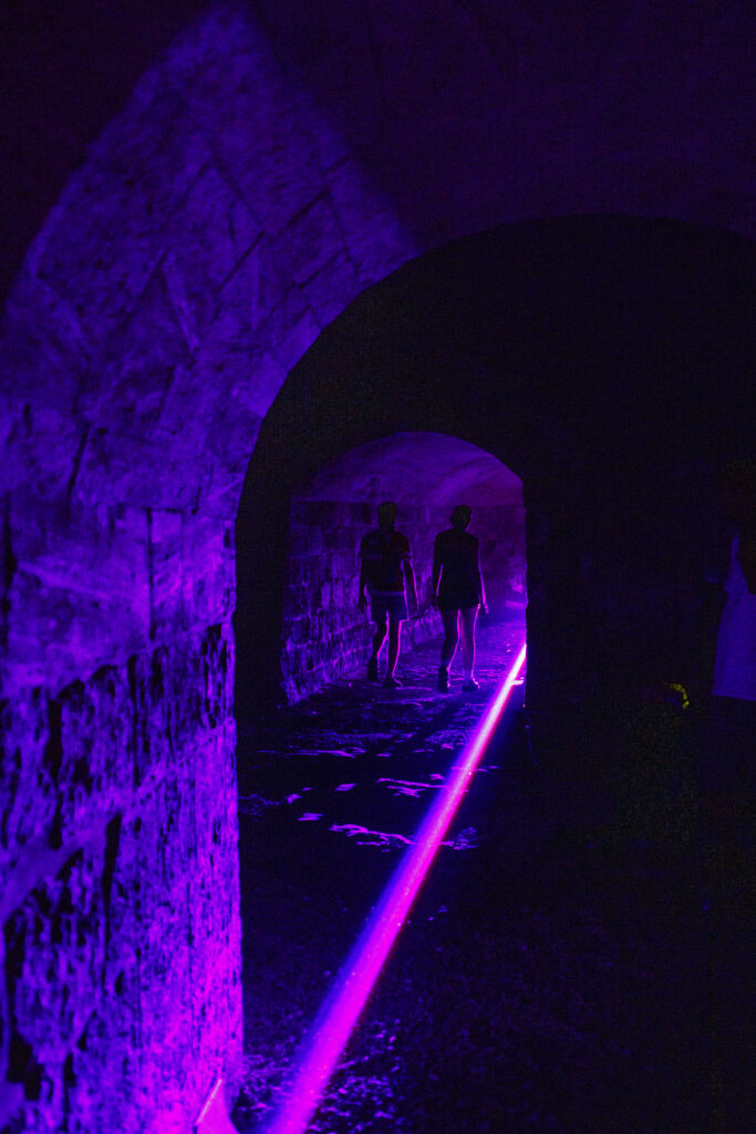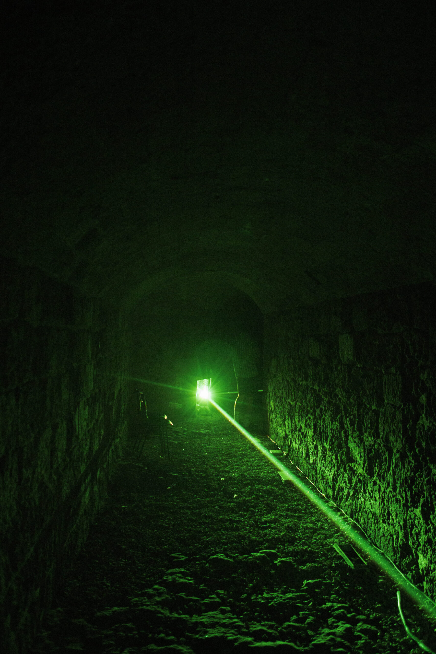 A dot is projected through the edges of the castle basement. The irregular walls are stitched together in a straight line. Beam uses light and its interaction with complex spaces serving as a “red thread” to entangle rooms. Follow the thread from begginning to end. Do not look into the light. Risk of blinding. Long term exposure of the beam might burn skin (~30 secs).