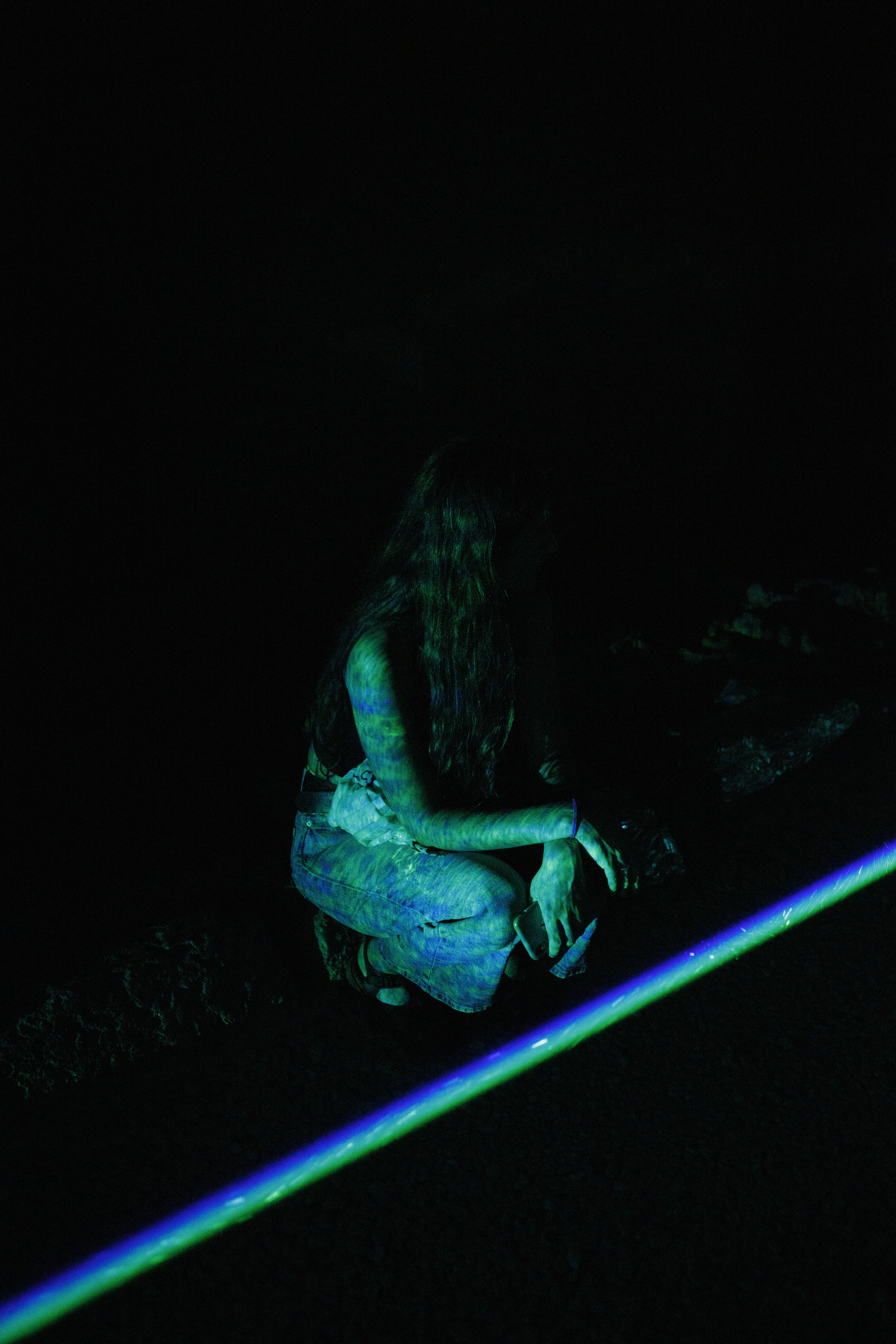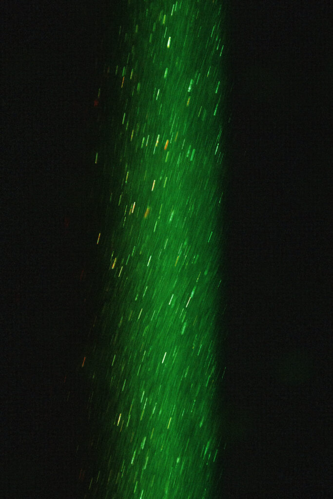 Un punto viene proiettato attraverso i bordi del seminterrato del castello. Le pareti irregolari sono cucite insieme in linea retta. Il raggio utilizza la luce e la sua interazione con spazi complessi che fungono da “filo rosso” per intrecciare le stanze. Segui il filo dall’inizio alla fine. Non guardare la luce. Rischio di cecità. L’esposizione prolungata al raggio potrebbe causare ustioni alla pelle (~30 sec.).