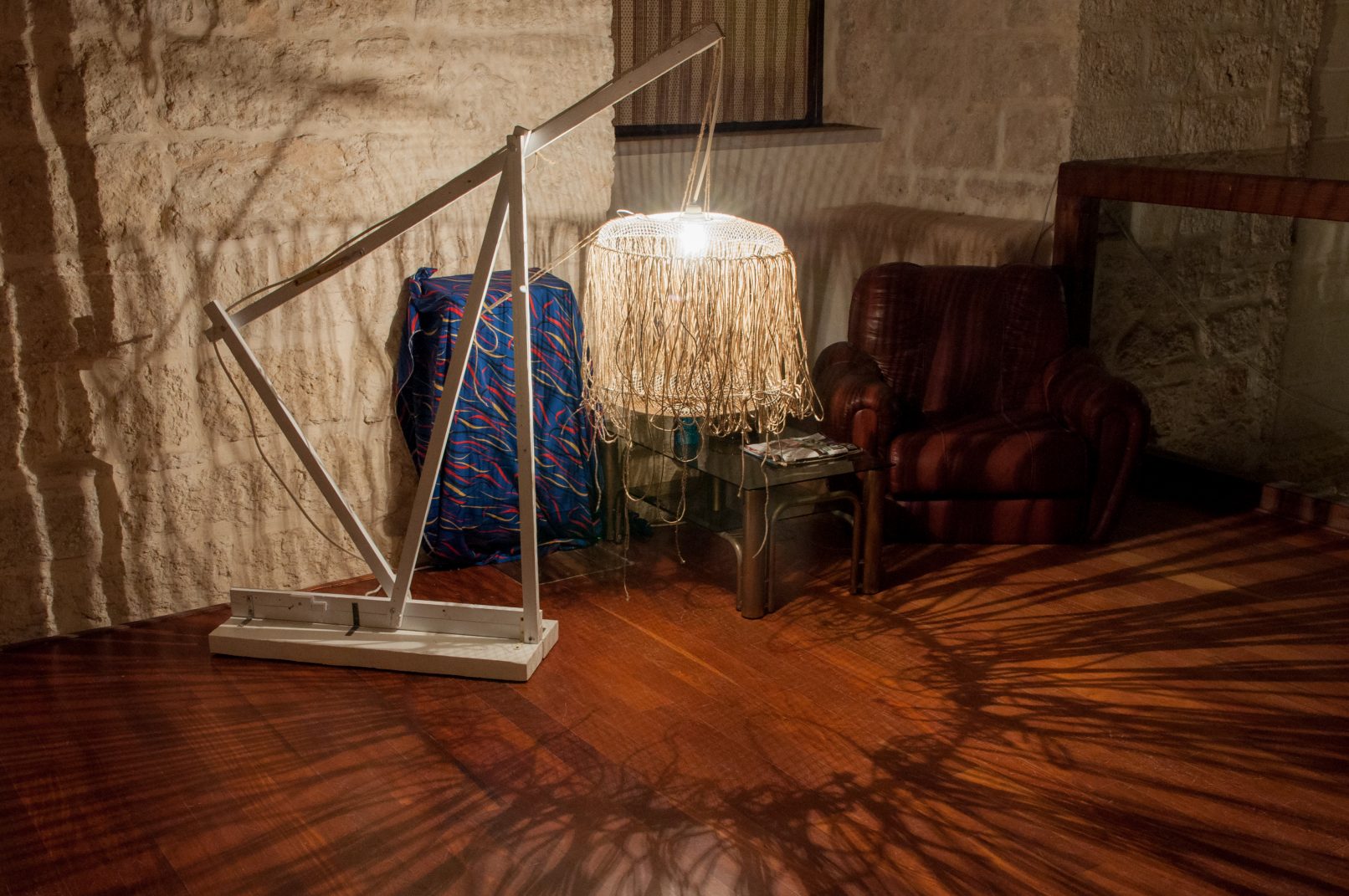 Ogni lampada prodotta si è “auto progettata” dato che ognuna nasce dal contatto diretto e casuale tra i materiali di cui queste sono composte. L’incontro con alcuni oggetti ne ha prodotti degli altri e il recupero di materiali di risulta è al centro dell’idea generale di progettazione. Le lampade sono dislocate in diversi punti dello spazio espositivo; a volte a supporto degli interventi degli altri autori.